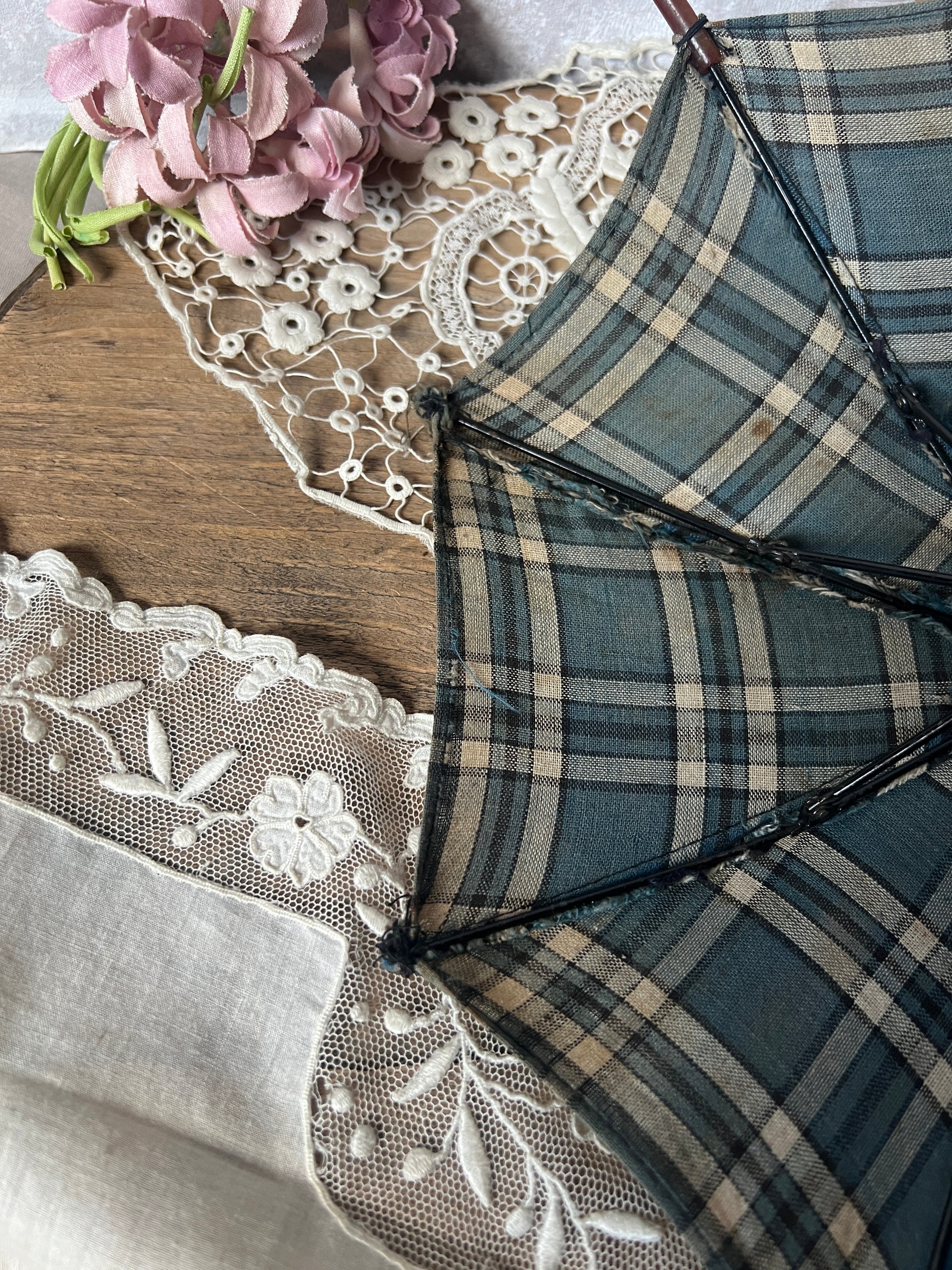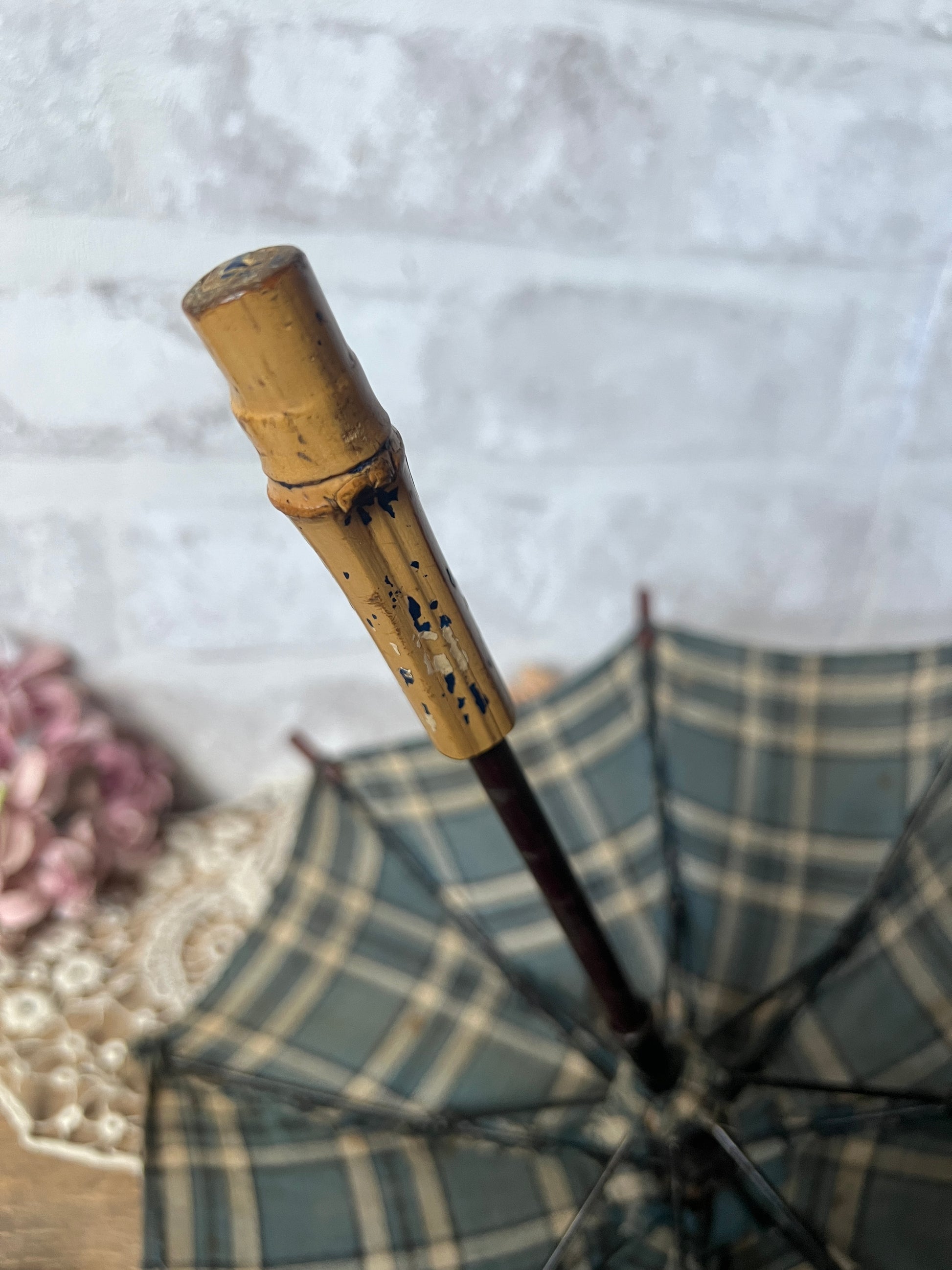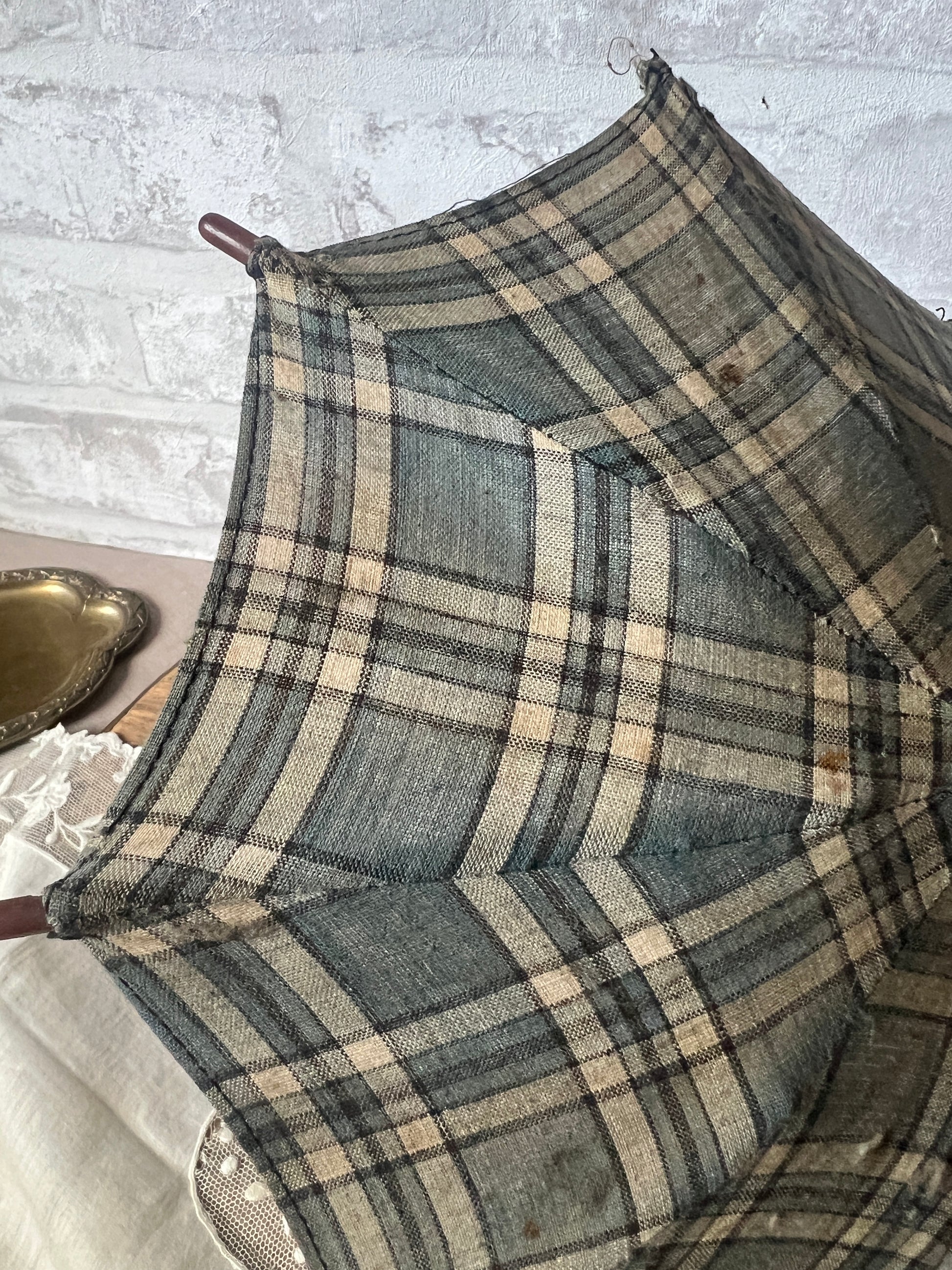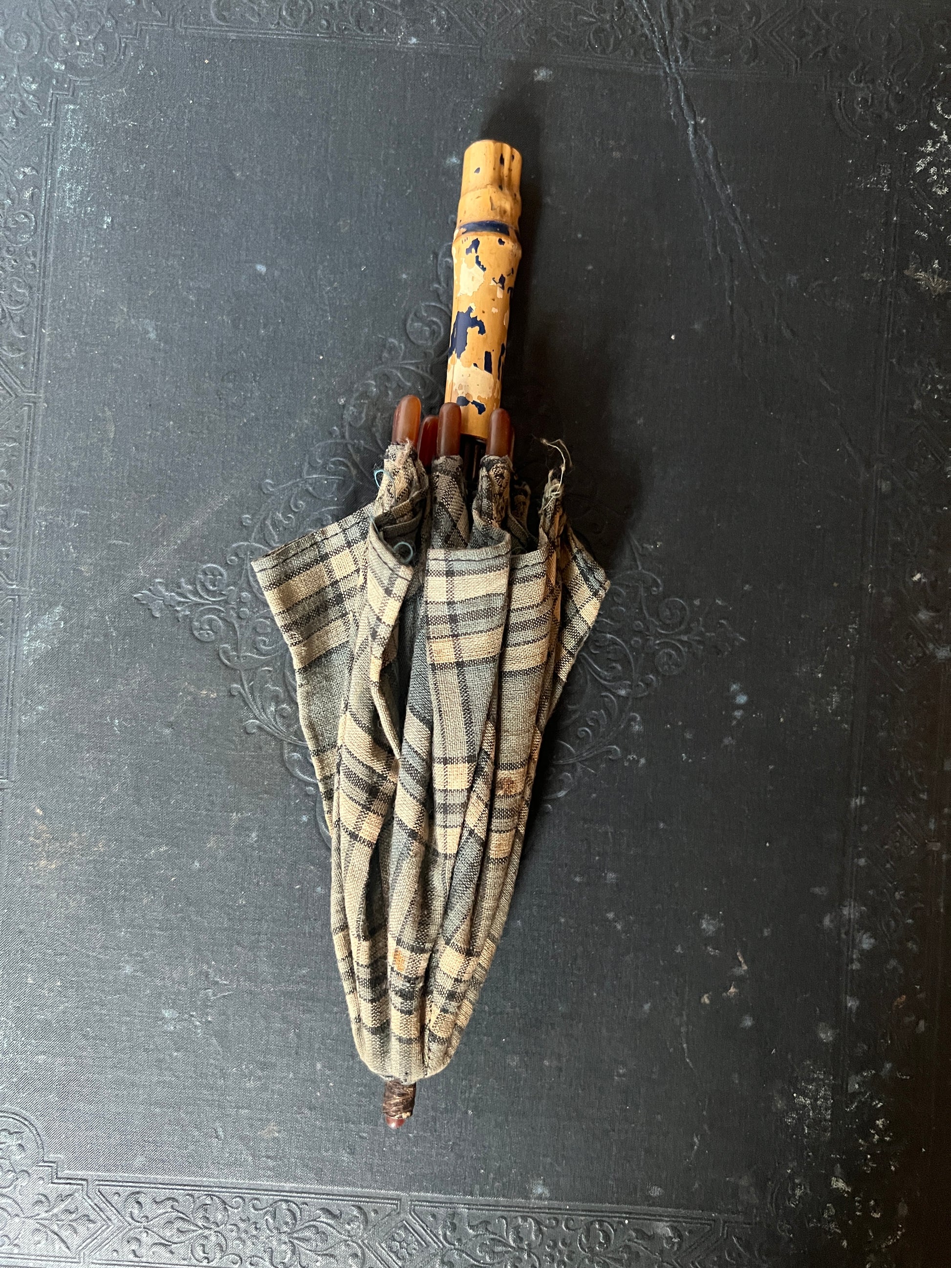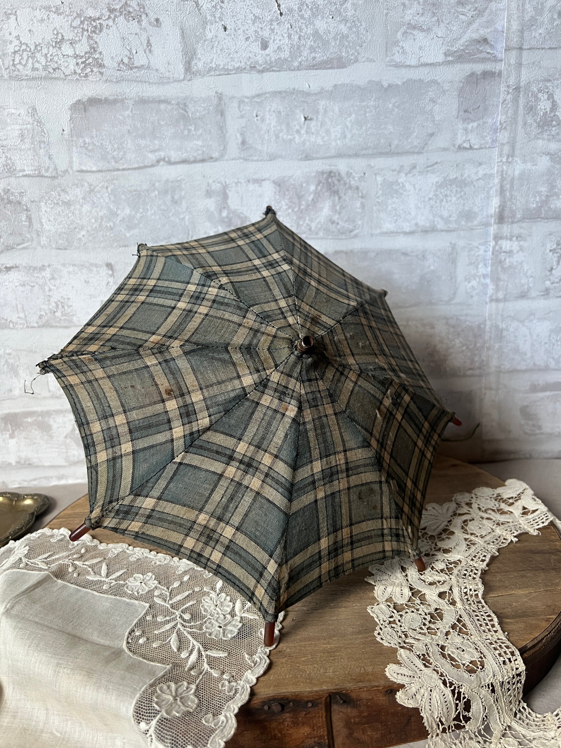 落ち着いたブルーとベージュのチェック柄のフランスのアンティーク・ドールパラソルです