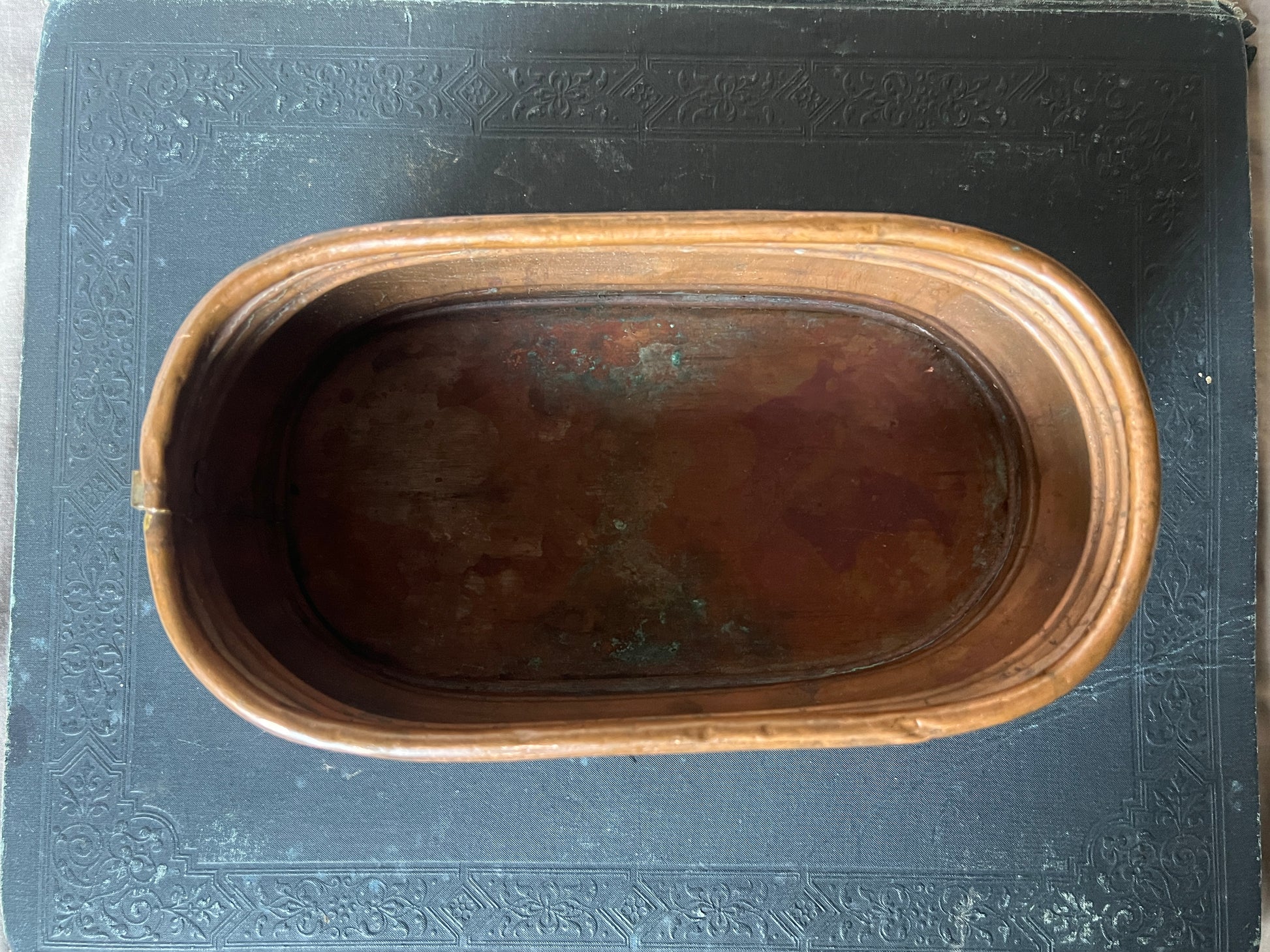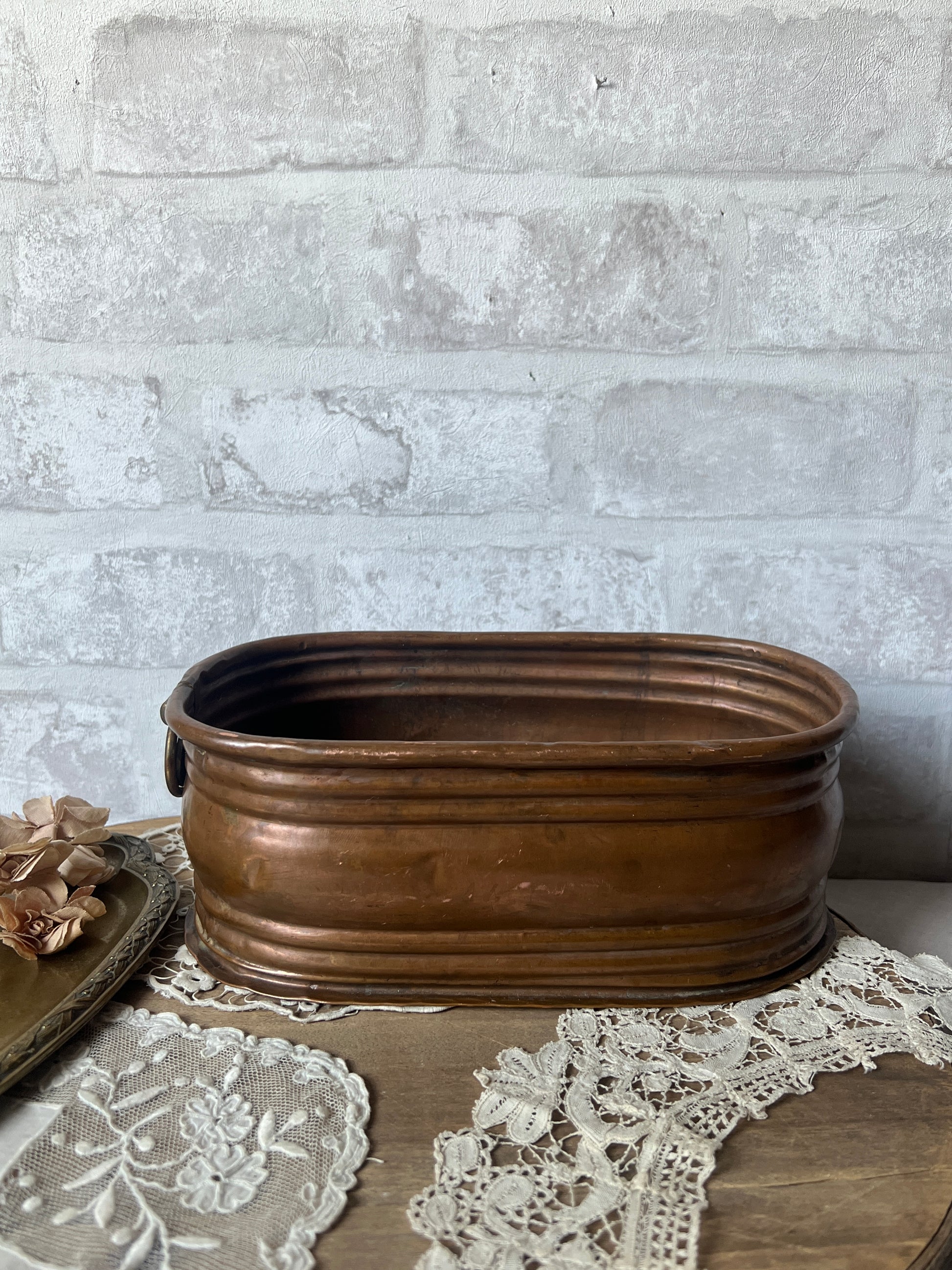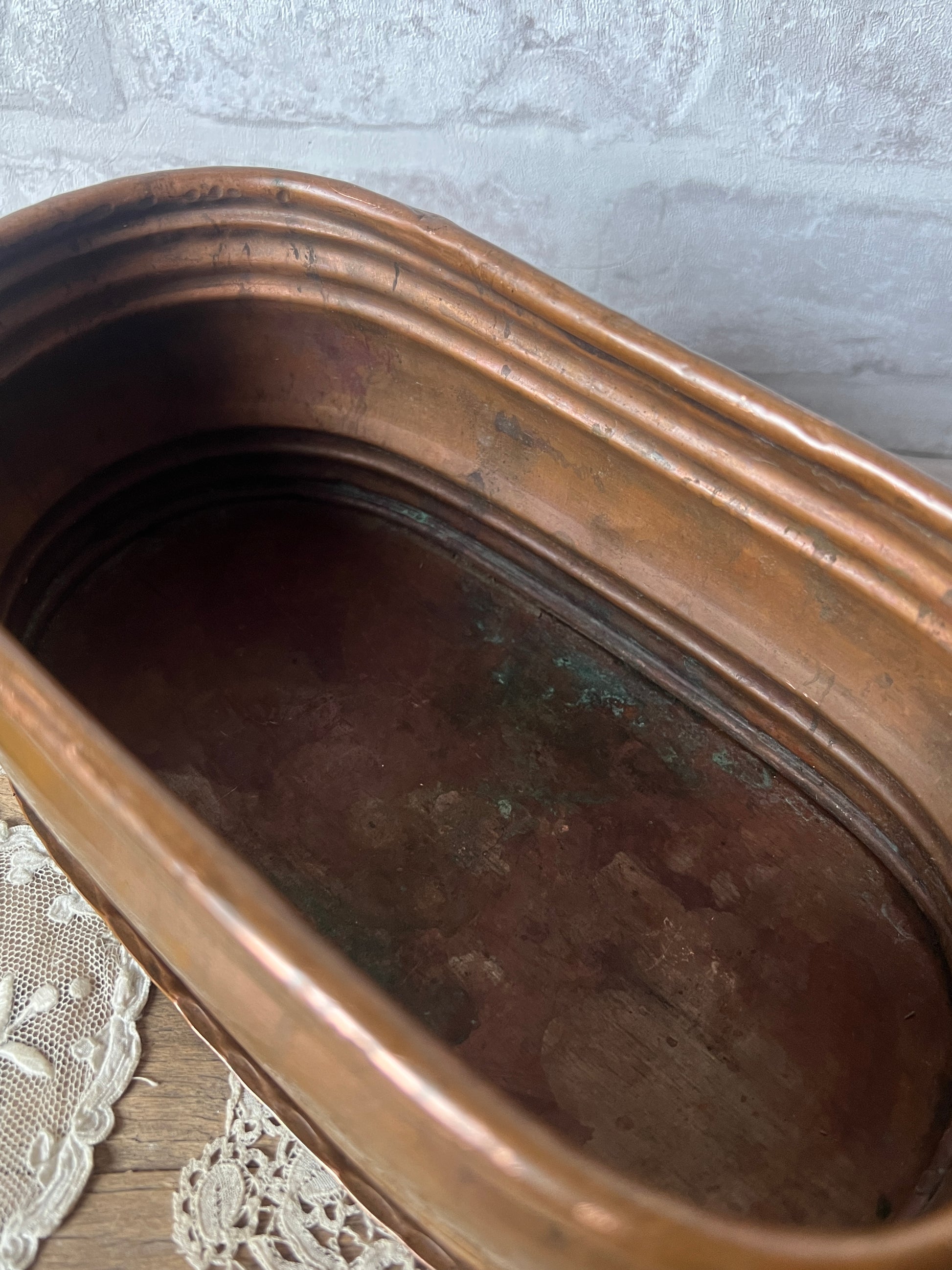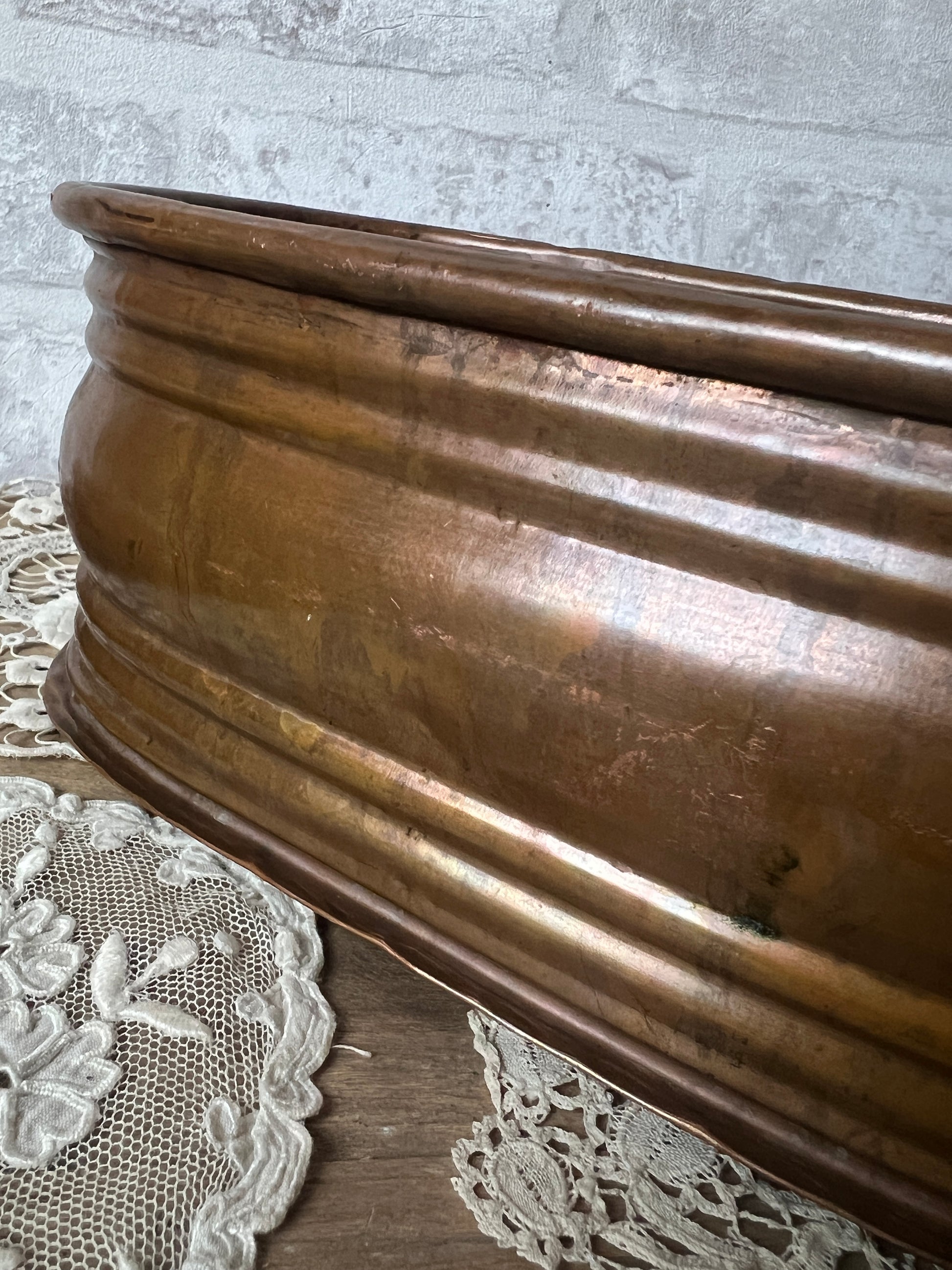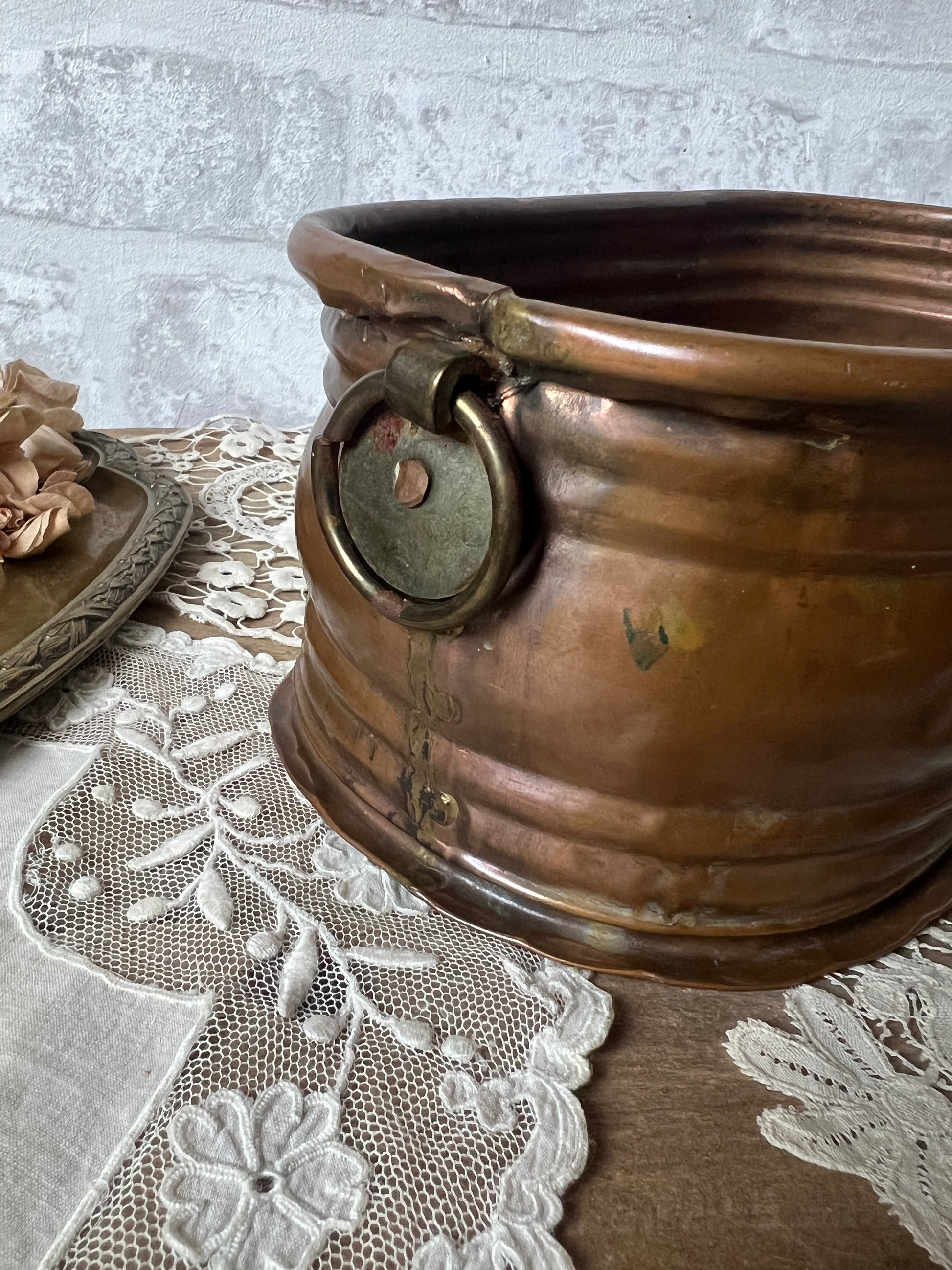 銅製品特有の重厚感と、長い年月を経て刻まれた細かな傷や変色が、唯一無二のアンティークな表情を作り出しています